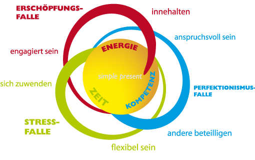 Das zugrundeliegende simple present® – Modell umfasst wichtige Aspekte und Anregungen zum eigenen Kompetenz-, Energie- und Zeitmanagement. Immer bezogen auf die konkrete Alltagssituation werden Belastungsfaktoren analysiert, Ressourcen aufgedeckt und Kommunikationstechniken trainiert, um eigene Bedürfnisse formulieren und Stärken nutzen zu können.