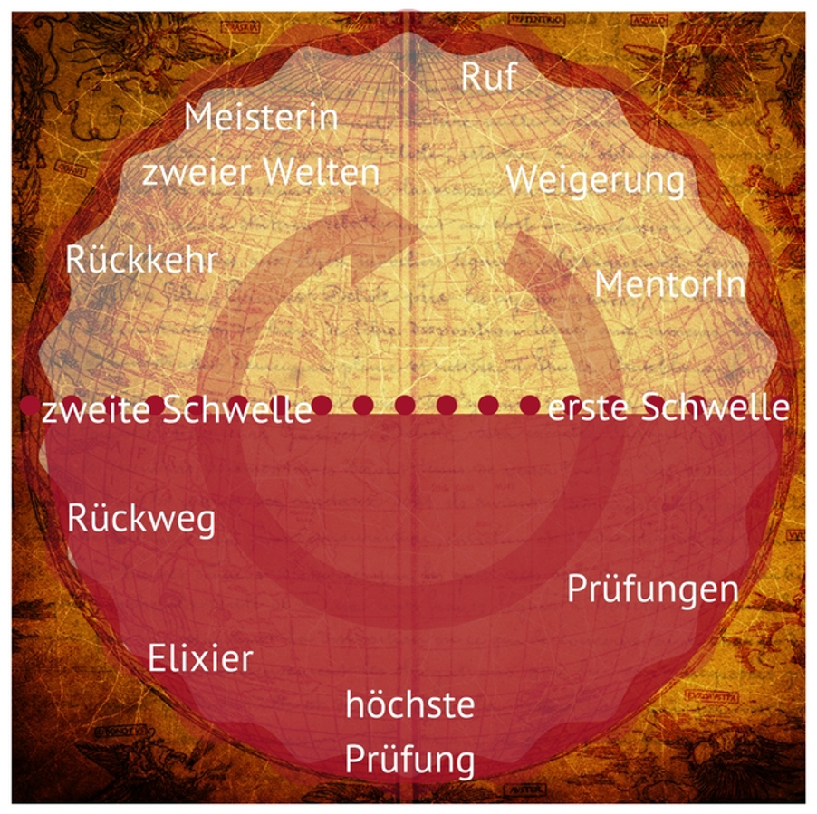 Das aus Märchen und Mythen bekannte Modell der „Heldenreise“ steht für persönliche Entwicklung und Veränderung. Es dient im Seminar als roter Faden, der die einzelnen Schritte aus dem gewohnten Alltag bis zur gelingenden Vereinbarkeit von Privatleben und Beruf thematisiert.